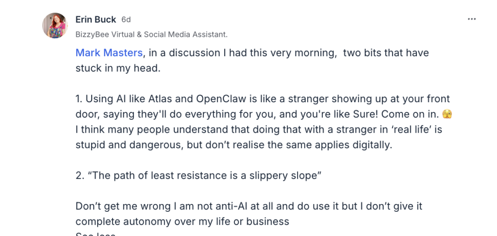 It can write all of our articles, produce scripts, summarise trends, build presentations, optimise workflows and mimic tone. It can compress time and remove friction. I was even drawn into the Clawdbot rabbit hole last week and it was comments from people such as Erin Buck, that gave me a shake as I was being hypnotised.