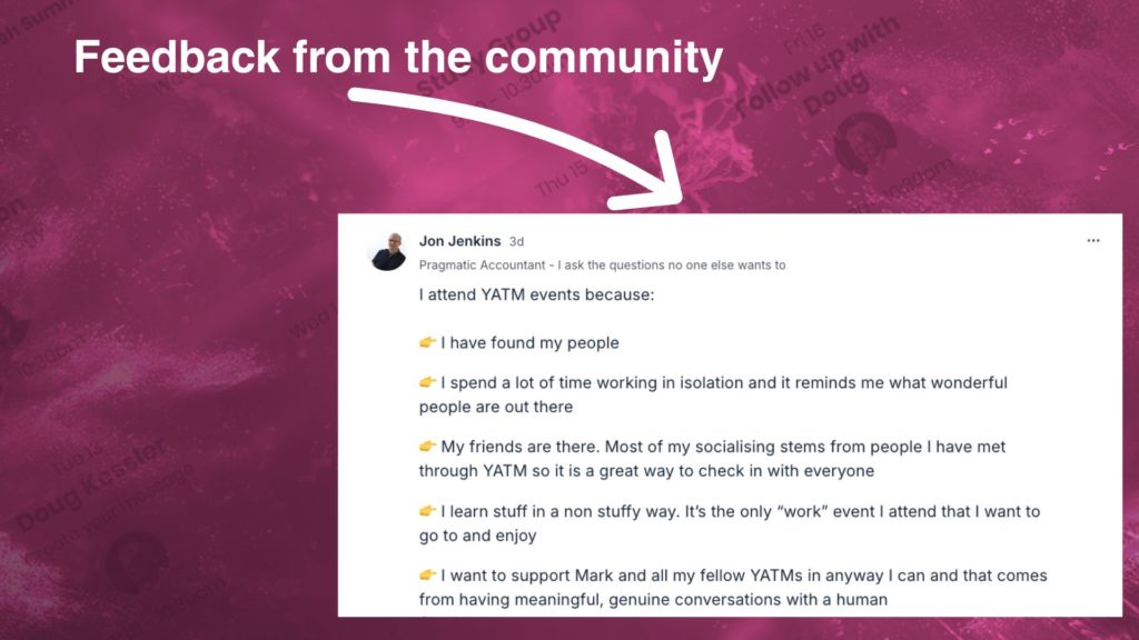 The strongest events aren’t built that way, they’re built when the people in the room become the experience itself. Jon Jenkins put it simply, “I have found my people, as most of my socialising stems from people I have met through YATM.”