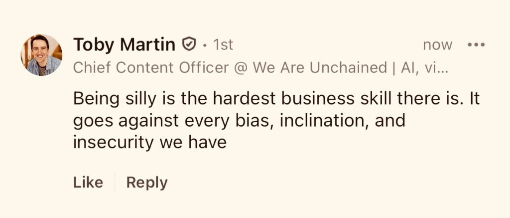 And this line from Toby Martin is so important, “Being silly is the hardest business skill there is. It goes against every bias, inclination, and insecurity we have.”