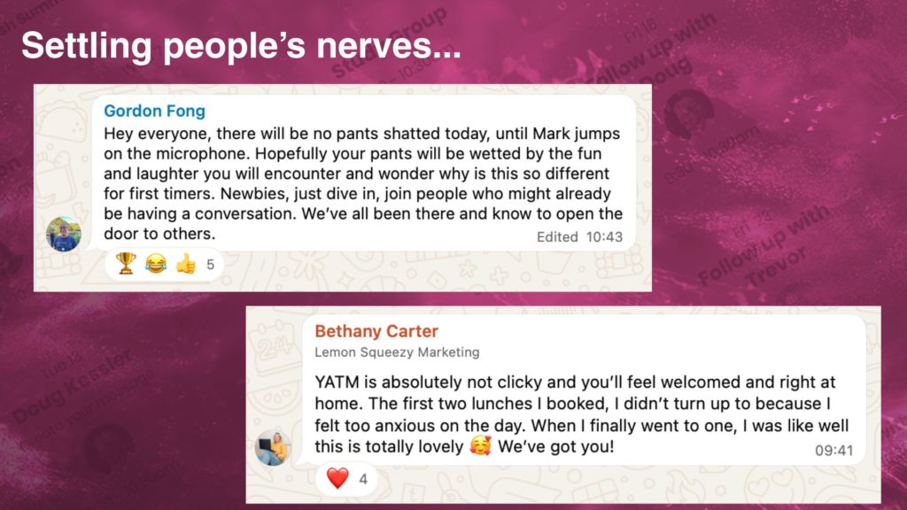 The simple problem we had was that people didn’t know how to be there. What version was Lunch Club asking for? Were they stepping in as their business? Is it asking for people to step in as themselves? I understand now that I wasn’t missing value, but clarity.